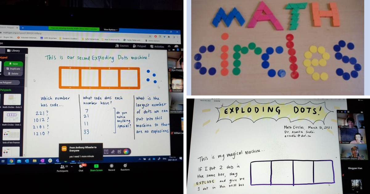 On Wednesday, March 31st, Dalhousie University hosted its latest virtual Math Circles evening. Dr. Asmita Sodhi (Dalhousie Mathematics Department) led the seminar, providing interactive opportunities and the mathematical motivation to make the event a great success. The topic itself, Exploding Dots, had our curiosity piqued, and the ensuing mathematical connection did not disappoint. The hour-long presentation was an uplifting mathematical experience. Time itself seemed to “explode”. First, participants were introduced to a ”2 to 1” exploding dot machine, where they introduced numbers into the furthermost right block of a series of attached boxes, and watched as pairs of dots exploded into one dot in the adjacent box to the left. This pattern continued in adjacent boxes until participants discovered that they were actually expressing numbers in base 2, or binary form.